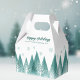 An elegant row of winter fir trees and snowflakes above your personalised Happy Holidays script and your business name in beautiful teal green below the snow filled forest. A modern corporate holiday party favour box with your custom message for company marketing.