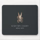 Chic personalised mousepad for your salon or hairstyling business features two lines of custom text in classic white lettering, on a soft black background adorned with a pair of flower-embellished scissors in faux copper foil.