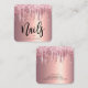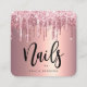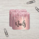 This gorgeous nails technician business card design features faux pink & copper rose gold dripping glitter metallic texture and elegant calligraphy font.