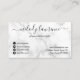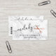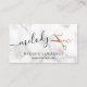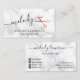 Modern and elegant business cards for hairstylists with faux copper rose gold scissors, white marble background and elegant calligraphy font.