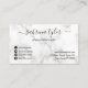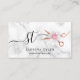 Modern and elegant business cards for hairstylists with faux copper rose gold scissors, roses, white marble background and elegant calligraphy font.