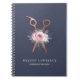 Modern and elegant notebook design for hairstylists with faux copper rose gold scissors, pink and white roses and elegant calligraphy font.