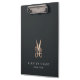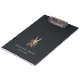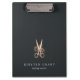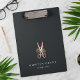 Chic personalized clipboard for your salon or hairstyling business features two lines of custom text in classic white lettering, on a rich soft black background adorned with a pair of flower-embellished scissors in faux copper foil. Design repeats on reverse side.