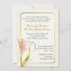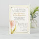 Elegant ivory coloured wedding invitation, with a thin gold tone frame and lovely graphics of a light coral and gold calla lily, in the lower left corner of the invitation. The back is also decorated with this lovely flower along with a gold tone band, with the bride and groom's names. Text in dark grey and golden brown is fully customisable to suit your needs. Pretty traditional style invitation, great for any season of the year.