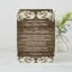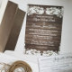 Old fashioned country chic wedding invitation with a romantic vintage elegance with lacy romantic vintage floral and a beautiful dark barn wood contrast. Nothing shabby about this wedding invitation, boho country charming.