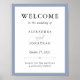 This elegant, stylish wedding welcome sign features chic black text on a white background, bordered in dusty blue.