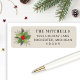 Elegant Christmas address labels feature a simple watercolor winter greenery arrangement with green holly leaves, red berries, grey eucalyptus branches, and pine sprigs. Personalise with your family's last name and return address text. Includes red, green, and neutral taupe grey colours on a creamy beige / off white background.