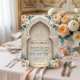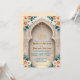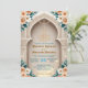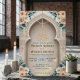 Set a sophisticated tone for your Nikkah ceremony or Walima reception with this elegant architectural design. The layout features soft peach roses and sage green leaves framing a printed faux gold Bismillah script against a cream background. Easy to customize with your specific venue details and dates.