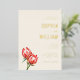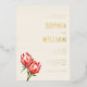 This elegant wedding invitation features a soft cream background with gold and warm floral tones, creating a sophisticated yet inviting atmosphere. The design includes realistic illustrations of protea flowers in rich reds and oranges, adding a vibrant touch to the minimalistic layout. The typography combines script and serif fonts for a refined hierarchy, while ample negative space ensures clarity and elegance. Perfect for couples seeking a formal and celebratory mood, this invitation is ideal for marking the special occasion of a wedding.