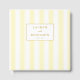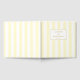This wedding guest book features a minimalist and modern design with vertical cream and pale yellow stripes, creating an elegant contrast. The layout centres around a small gold-bordered frame that highlights the names "Lauren and Benjamin" in classic serif typography, perfect for personalisation. Scattered gold confetti accents add a festive touch to the sophisticated aesthetic, making it ideal for celebrating a special occasion like a wedding.