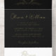 Elegant black all-in-one wedding invitation featuring your monogram initials inside a vintage wedding crest, your names, "Reception to follow" and "Rsvp" showcased in a chic calligraphy script, your invitation details in classic serif typography, and a white tear-away RSVP response postcard, all rendered in your choice of genuine gold, silver or rose gold foil. You can adjust the size of the script for longer or shorter names by editing in the design tool if desired.