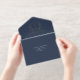 Elegant dark navy blue all-in-one wedding invitation featuring your monogram initials inside a vintage wedding crest, your names, "Reception to follow" and "Rsvp" showcased in a chic script, your invitation details in classic serif typography, and a white tear-away RSVP response postcard, all rendered in your choice of genuine gold, silver or rose gold foil. If desired, you can adjust the size of the script for longer or shorter names by editing in the design tool.