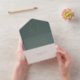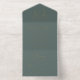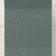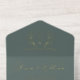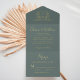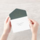 Elegant dark sage green all-in-one wedding invitation featuring your monogram initials within a classic wedding crest, your names, "Reception to follow" and "Rsvp" showcased in a chic calligraphy script, your invitation details in simple lettering, and a tear-away RSVP response postcard, all rendered in your choice of genuine gold, silver or rose gold foil. You can adjust the size of the script for longer or shorter names by editing in the design tool if desired.