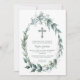 This modern baptism invitation features an elegant watercolor wreath of sage green leaves and silver-grey flower buds around a sage green cross. You can change teh colour on the back. MATCHING items in our store.