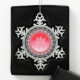 A single perfect ice crystal, set in gradient hues of red and pink; framed by a laced snowflake design...gives almost a snow globe like effect. The ice crystal is actually a template, allowing you to replace with a photo of your family or winter scene of your choice, should you prefer.