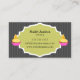 © Socialite Designs. Elegant, decorative swirl design banner and striped background, in grey, baker business card. The design incorporates a gourmet yellow and pink cupcake design on the front and back. All design elements can be individually moved, resized, or deleted by customising the business card.