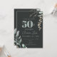 Modern and elegant 50th birthday invitation with floral accent and personalised name, date, location, time and RSVP information. The invitation has a black background with a subtle teal script. The invitation is very stylish and will add a sense of "class" to any 50th birthday celebration.