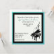 Lovely piano recital invitation done in a square format, with a teal and black frame around the edges. Graphics of a black grand piano, with musical notes floating up, decorates the right bottom corner of the invitation. All text is customisable to suit your event needs. Lovely way to showcase your students recital.