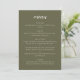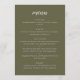 This customizable printed menu in olive moss adds a sophisticated and polished touch to your dining experience. Featuring a clean layout with elegant calligraphy at the top, it lists the appetizer, starter, main course options, and dessert in an easy-to-read format. Perfect for weddings, rehearsal dinners, or any formal event, these menus guide your guests through the delicious selections planned for your celebration while enhancing your table settings. Pair them with coordinating table decor for a seamless and refined aesthetic.