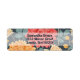A return address label featuring elegant red and yellow dahlia flowers on a dark blue background.