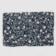 This seamless floral pattern features delicate white daisies with soft yellow centres, surrounded by pale green leaves and tiny buds, all set against a deep navy blue background inspired by William Morris. The design exudes a classic, timeless elegance perfect for wallpapers, textiles, and stationery. The contrast between the vibrant flowers and the dark backdrop creates a sophisticated and calming aesthetic.