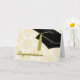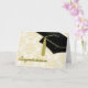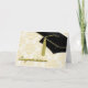 Stylish graduation greeting card, done in a pale golden yellow and off white damask pattern, with graphics of a black graduate's mortarboard cap, with a gold tone tassel, in the upper right corner. Gold tone graphic script text reads Congratulations, on the front. Black text greeting, on the inside, is ready to personalise to read what you want. Pretty card to your favourite graduating girl.