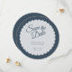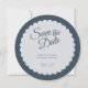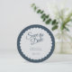 Elegant yet modern and with a touch of retro glam, this Wedding Save the Date card features a scalloped shaped circle, dark blue and light blue and elegant script calligraphy. Customise this design with your own wedding information.