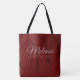 ...personalised with your own special name... over-sized script font style monogram... a nice and monogrammed dark red tote-bag