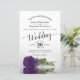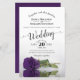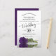 This beautiful wedding invitation features a romantic design with a single long stemmed royal purple coloured rose laying on its side and reflecting in a pool of water. The typography features lacy script calligraphy and a sophisticated layout. The back is a deep marbled violet or purple colour. Wonderful way to invite your friends and family to share in your joy on your special day.