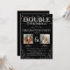 Elegant graduation party invitation for a double celebration, featuring a trendy black background that can be changed to any colour, string fairy lights, faux silver glitter, a picture of each graduate and a modern white font template, which can easily be customised.