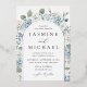 Elegant floral wedding invitations featuring your wedding details with a silver foil arched frame of dusty blue and white roses, hydrangeas, and lush eucalyptus leaves and greenery. This dusty blue floral wedding invitation is perfect for your spring or summer wedding!