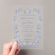 These elegant, clear acrylic wedding invitations feature a vintage dusty blue watercolor floral frame with lovely botanical leaves, and stylish calligraphy along with classic text. The French look blue toile design will add a romantic and chic touch to your wedding stationery.