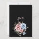 A chic bouquet of pink and blue wildflowers with an dusty nature, surrounded by a black background with elegant handwriting.