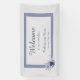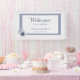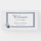 This is an elegant floral wedding welcome banner with light blue and navy blue watercolor flowers on a light dusty blue background design. It is perfect for a classic winter wedding celebration.