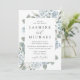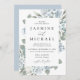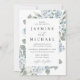 Elegant floral wedding invitations featuring your wedding details surrounded by dusty blue and white roses and hydrangeas with lush eucalyptus leaves and greenery. This dusty blue floral wedding invitation is perfect for your spring or summer wedding!