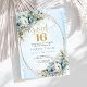 Celebrate a milestone moment with this elegant Sweet Sixteen invitation, featuring a refined watercolor design of dusty blue florals blended with soft white flowers and fresh eucalyptus greenery. Framed by a shimmering gold glitter border and paired with graceful script lettering, this invitation sets a sophisticated tone for a truly unforgettable Sweet Sixteen, Sweet 16th, or 16th birthday celebration.