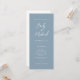 Our elegant slim wedding program card is perfect for your minimalist wedding celebration. A beautiful white calligraphy script font paired with simple and clean text sits on a soft blue background to the front of the card. The white reverse has tonal blue text, creating an elevated look to complement your stylish event. Easy and quick to customise yourself with your own wedding details.