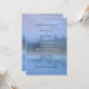 The wedding invitation is an elegant dusty blue minimal nature design. It has trees and mountains and shows watercolor tree and sea shapes.
