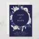 This elegant save-the-date card features a navy blue background with a dusty blue and white floral wreath framing the centre. The text is simple and classic, using a white font that stands out against the dark background. The overall design is clean and sophisticated, making it a perfect choice for a formal or upscale wedding.