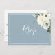 This elegant simple dusty blue RSVP postcard features a watercolor ivory floral design with elegant script font.