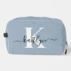 This simple, elegant dusty blue toiletry bag with your first name in a trendy script font in black and your first initial in a modern cap font in white is perfect for you. It's stylish and trendy and yet very classic. It will be fabulous for school, the gym, work, your car - will make keeping your makeup or toiletries all in one place when you're away from home.