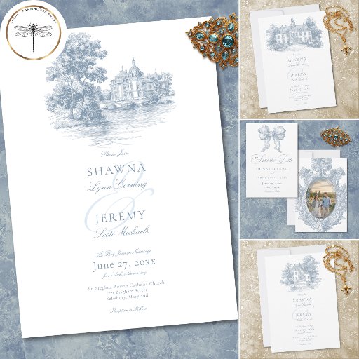Elegant Dusty Blue Toile French Manor Wedding Invitation