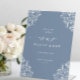 Display this standing elegant dusty blue wedding guest book sign by your wedding guest book. This elegant wedding sign features a vintage design at the corners and is perfect for a classy and sophisticated dusty blue wedding. View more matching products below.