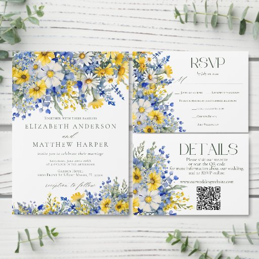 Elegant Dusty Blue Yellow Wildflowers Boho Wedding Invitation