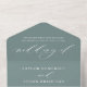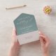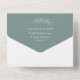 Muted dusty eucalyptus green and white all in one wedding invitation with understated calligraphy script and classic serif typography. The dusty, grey-green background with soft blue-green undertones gives "Wedding Of" a quiet, organic elegance in flowing hand lettering. A tear-off RSVP postcard with meal selections is included, and the back can be personalised with each guest's address for direct mailing without envelopes. A delicate botanical leaf accent complements the natural colour on the return address flap. Fully editable text and colours.