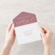 Lovely dusty rose and white all in one wedding invitation showcasing flowing calligraphy script paired with refined serif type. The warm, muted rose background lends "Wedding Of" a vintage-inspired softness in graceful hand lettering. Features a tear-off RSVP postcard with entrée selections and personalizable guest addressing on the back for envelope-free mailing. The return address flap includes a delicate botanical leaf sprig. Every detail is fully editable to match your celebration.
