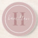 An elegant sandstone coaster featuring a dusty rose serif initial and custom family name in script, framed by a white circle on a soft light mauve background. The muted, romantic tones create a sophisticated feminine accent that pairs beautifully with neutral or blush decor. A lovely personalised gift for housewarmings, bridal showers, or birthdays. All text is fully customisable.