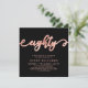 Elegant Trendy Chic Black and Rose Gold Eighty Script 80th Birthday Invitation. This modern birthday party invitation template for woman features stylish „eighty” text in huge faux rose gold foil swirly handwritten calligraphy (or typography) script with swash tail font, party details in blush rose gold colour on black background. At the reverse side faux rose gold foil abstract swirly wave circle pattern on black colour background. Perfect for celebrating, girly eightieth milestone birthdays in style, this invitation adds a touch of glamour to any feminine party.