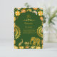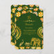 This elegant Hindu wedding enclosure card features a rich emerald green background with a marigold floral pattern and an emerald moghul arch. Intricate gold details of lotus, peacock, elephant, and an Om symbol frame your personalised details, perfect for sharing additional wedding information with your guests in a luxurious and traditional design.