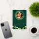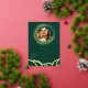Create unique wedding invitations with an emerald green and gold design with custom photo and text. These invites are decorated with elegant emerald eucalyptus wreath and foliage and an agate style pattern. Templates make it easy to personalise and customise. Please use the template to upload the photo to get it in a round shape. The square picture works the best.